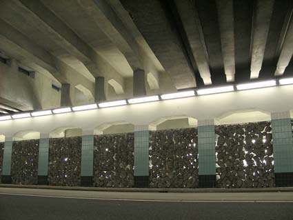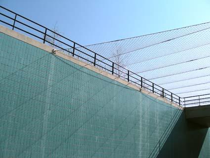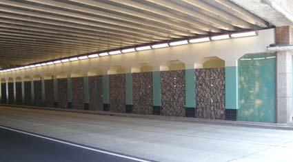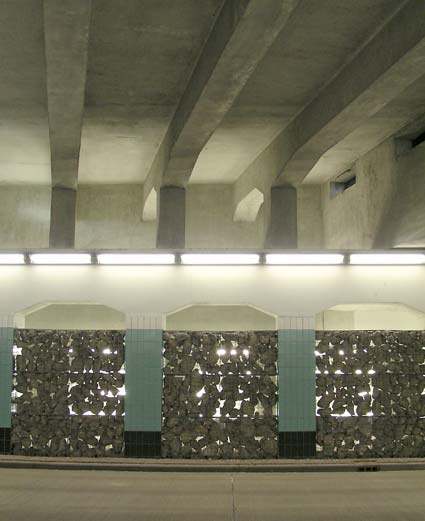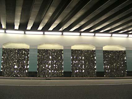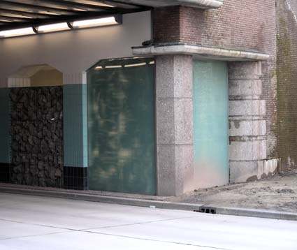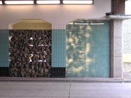basaltblokken, staal, gelaagd glas, TL-balken en wilde wingerdplanten.