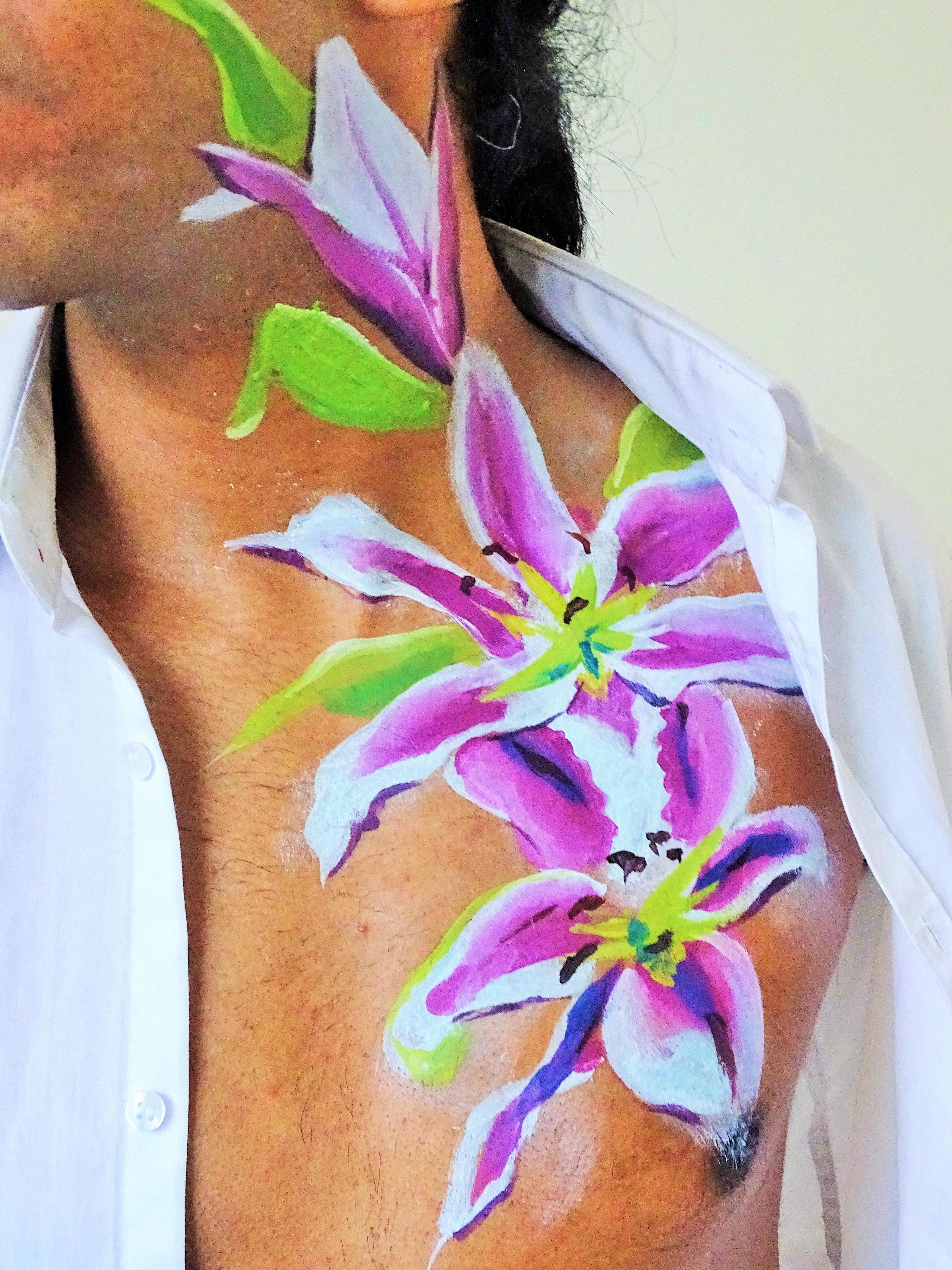 Mensen gaan letterlijk en figuurlijk bloeien als ze gebodypaint worden met grote blije motieven. Ik gebruik de Flowerpowerbodypaint op delen van het menselijk lichaam om de wereld een klein stukje blijer te maken.