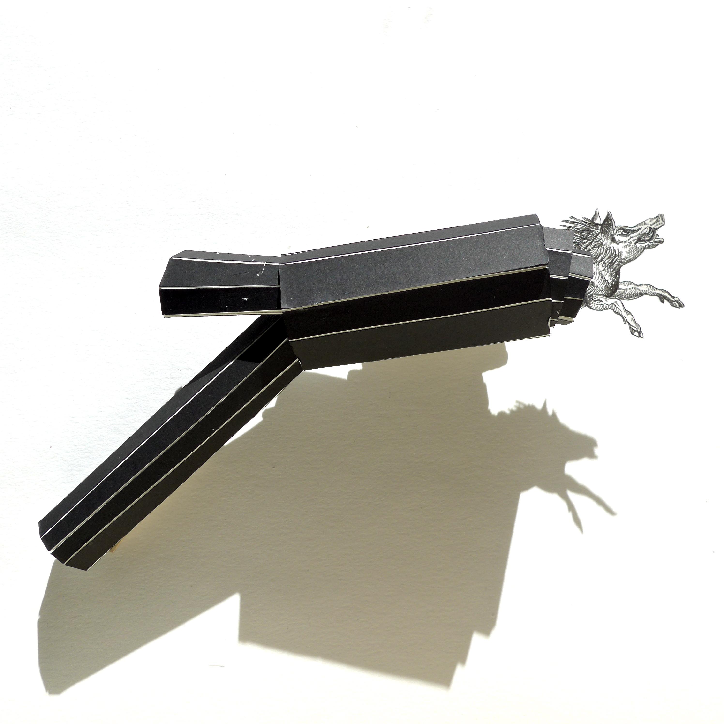 Papier en karton als drager en (ver)beeldend element tegelijkertijd. Lange tijd in een witte vorm gegoten waardoor de serie "Vrouw schenkt wit" ontstond, sinds 2017 echter in het zwart gestoken. Een nieuwe, duistere serie is aan het groeien.